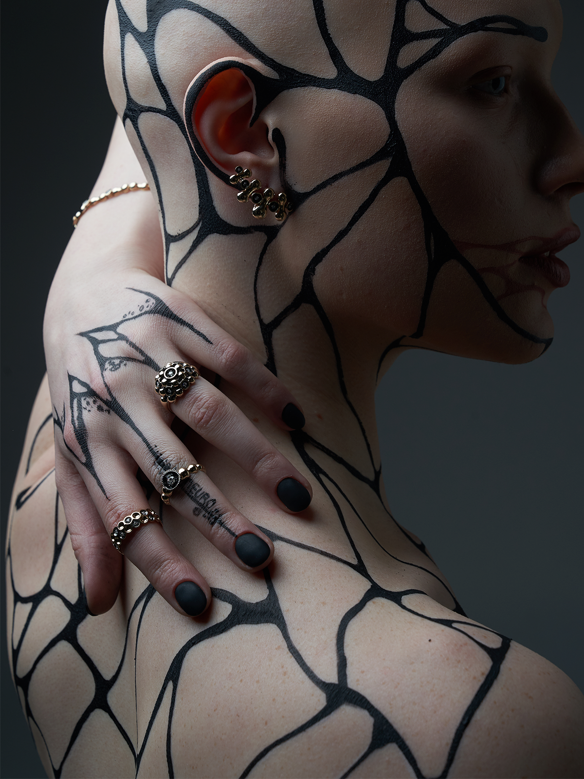 Эти овальные «капли» — аллюзия на нейроны головного мозга, что формируют наше мышление, сознание и способность логически мыслить. Такое украшение вполне могли носить и герои киберпанк-жанров в современной литературе — ведь сочетание современного дизайна и классики смотрится, как гость из 22-23 века.