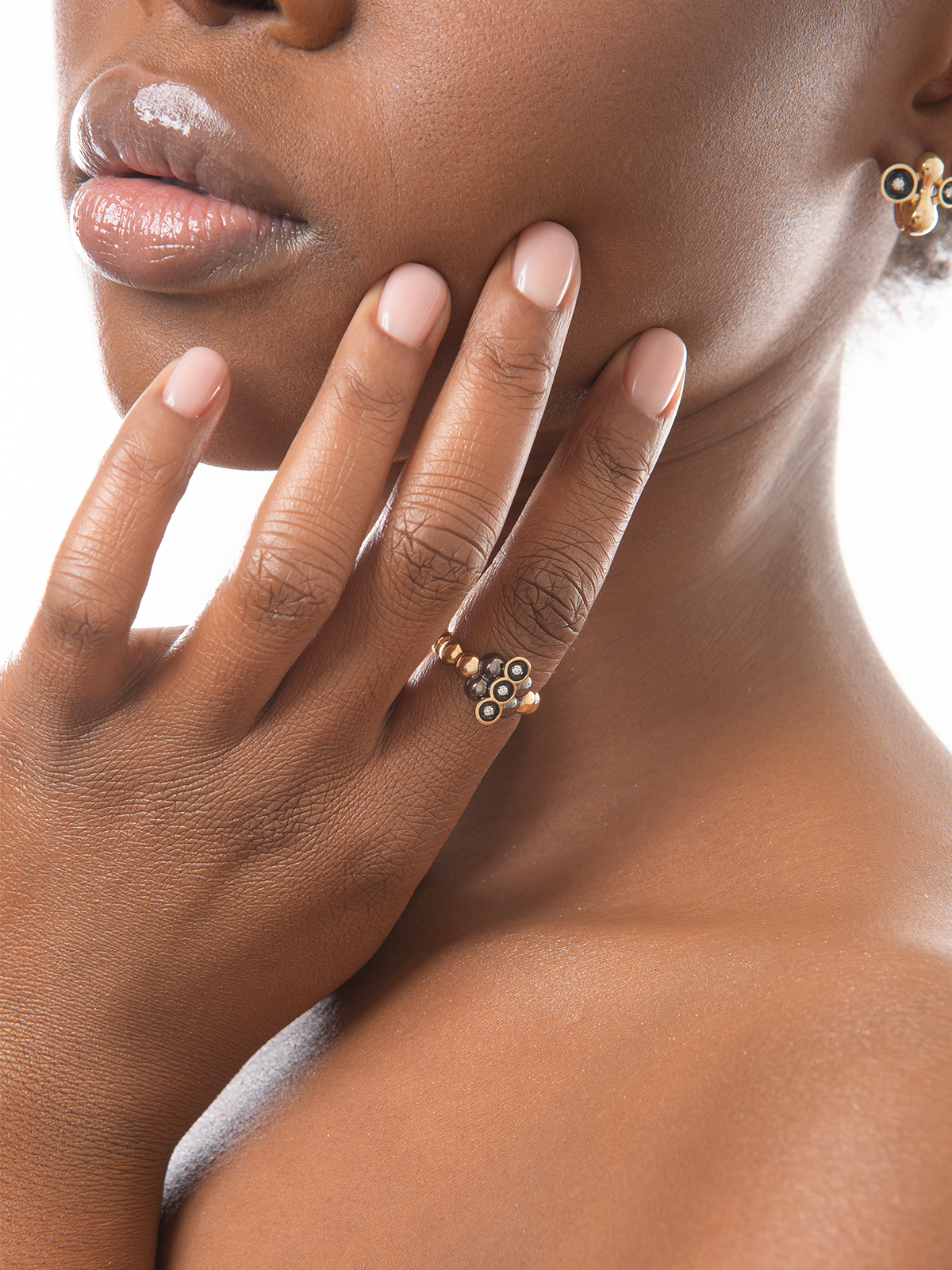 Это золотое кольцо выполнено в форме множества круглых «нейронов», что соединяются в красивую композицию. Округлой сделана и форма основы кольца — так, чтобы украшение было цельным, завершенным и очень стильным.