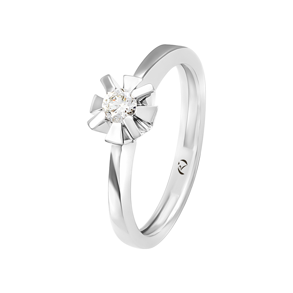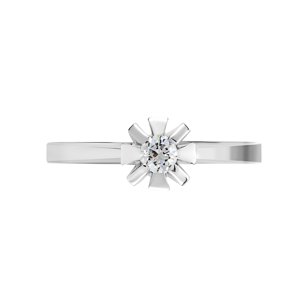 В центре ювелирного шедевра находится крупный бриллиант классической огранки. Его безукоризненная чистота и качество подтверждается сертификатом, а лепестки крепления напоминают маленькую корону.