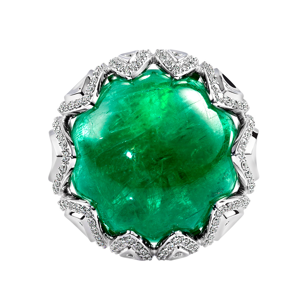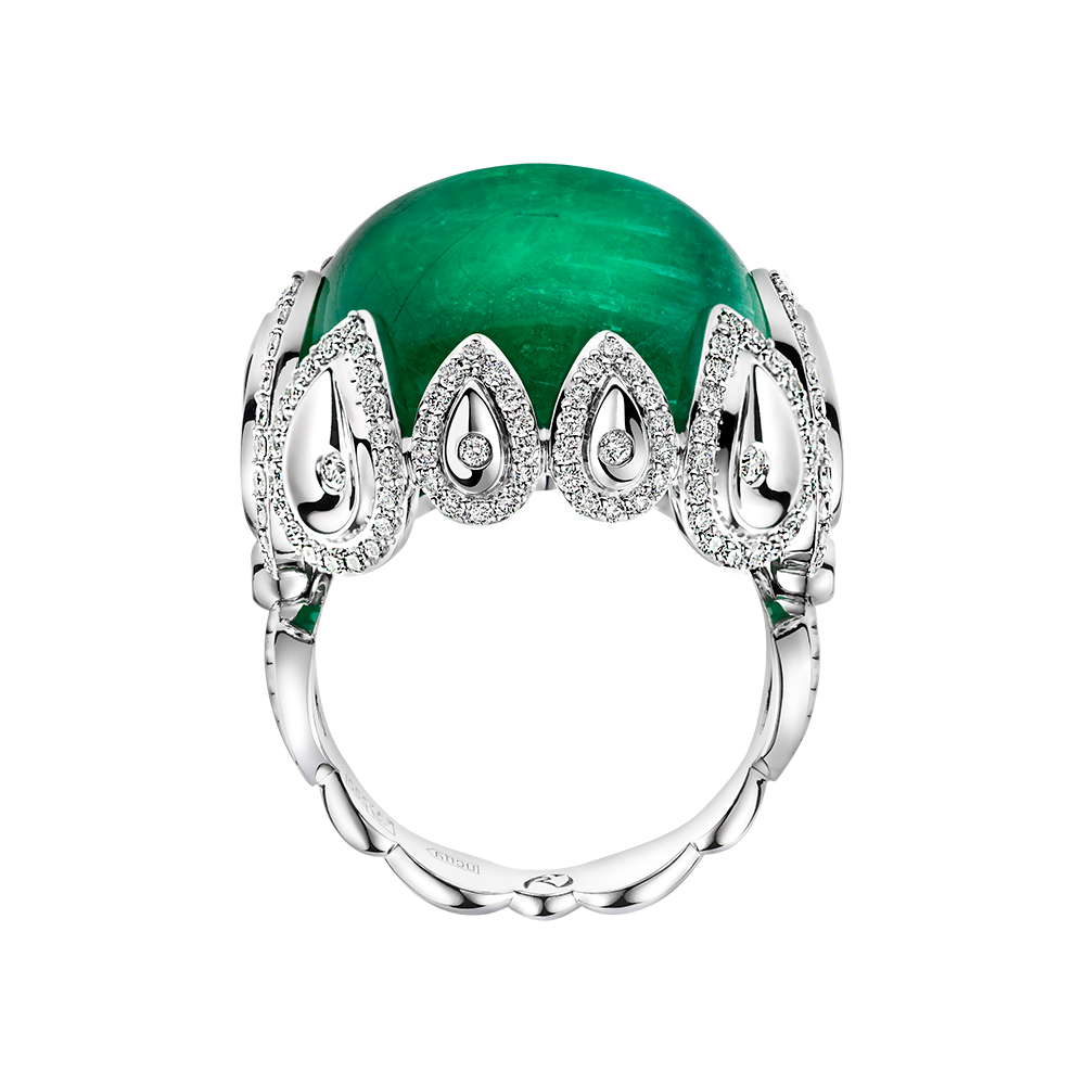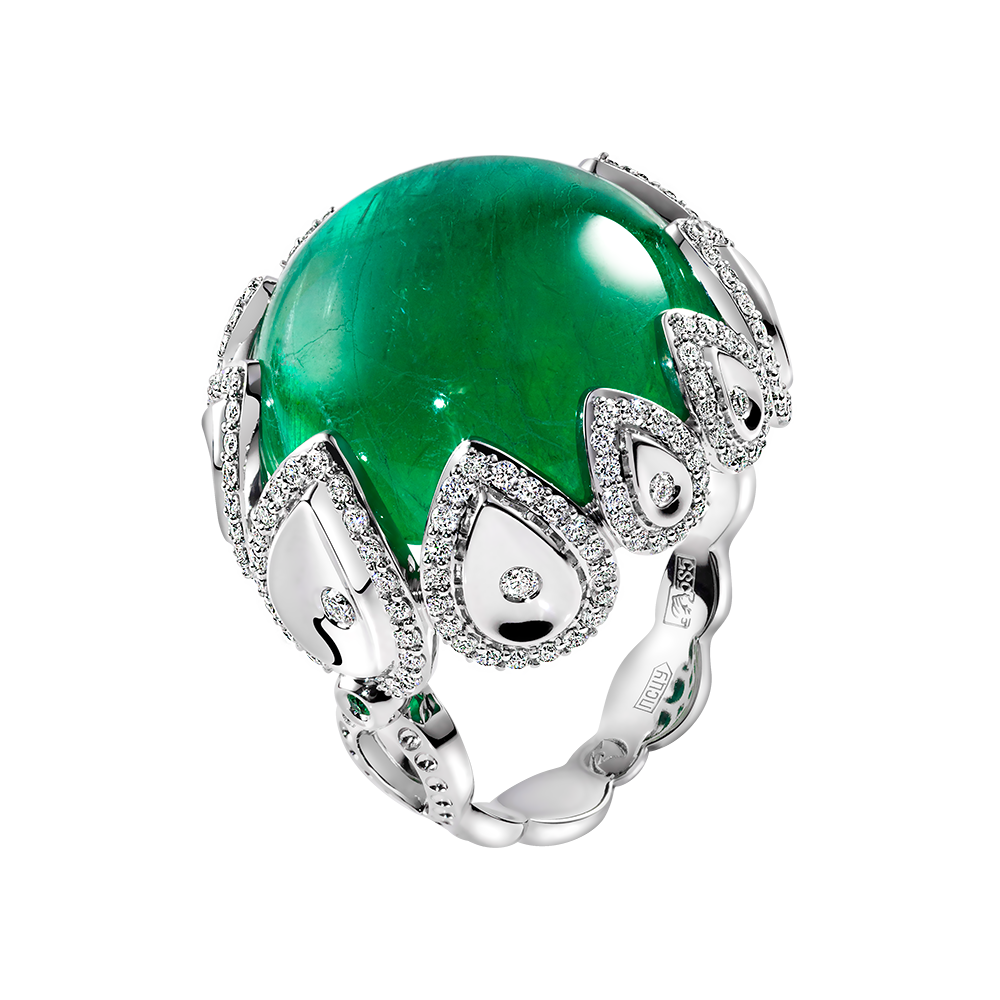 В центре ювелирного шедевра находится достаточно крупный изумруд, чья огранка выполнена в особой классической манере. Став частью композиции украшения, этот камень выделяется среди множества других — напоминая старинные драгоценности, что многие века были частью фамильной коллекции венценосных особ.