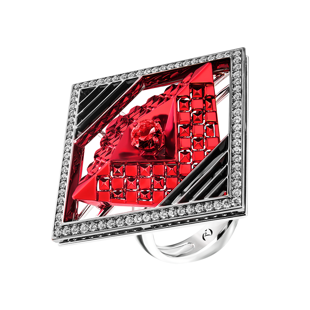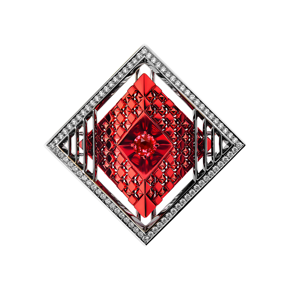 Это эксклюзивное кольцо из коллекции RED является ярким представителем авангардного искусства. Оно изготовлено из белого золота и украшено ослепительными бриллиантами, которые рамкой обрамляют центральный камень — глубокий и насыщенный сапфир весом 0,643 карата. Дизайн кольца основан на использовании геометрических элементов, создающих сложную мозаику, которая отражает и играет светом, добавляя украшению визуальной глубины и динамики.