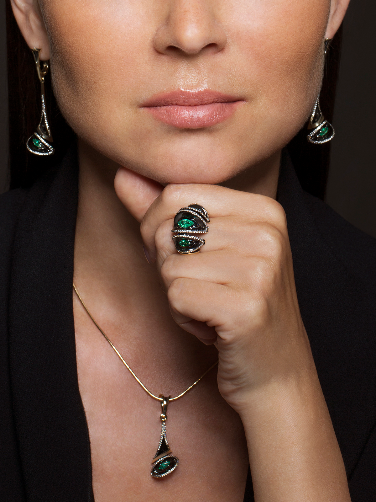А в центре каждого такого элемента — безупречные изумруды, завершающие образ оригинального украшения, в котором чувствуется стиль и роскошь. Именно такой должно быть ваше новое украшение для личной коллекции: безусловно оригинальным, стильным и привлекающим взгляды окружающих.