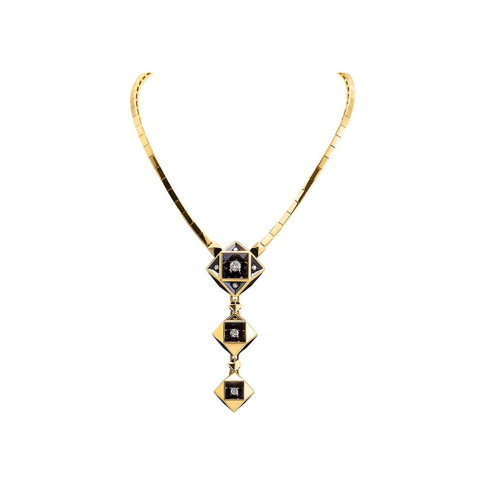 Ее особенность — в использовании стиля кристаллов, что дарованы нам природой. Яркие золотые грани, слегка подчеркнутые эффектом чернения, блестящая поверхность полированного золота, чистые драгоценные камни… все это демонстрирует истинную роскошь, от которой невозможно отказаться.