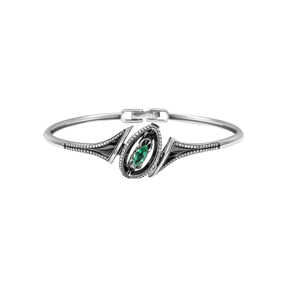 Изящный и стильный браслет дополняет образ современной деловой женщины. Такое украшение выбирают и к повседневному стилю в одежде, ведь этот золотой браслет с бриллиантами и изумрудом отличается универсальностью.
