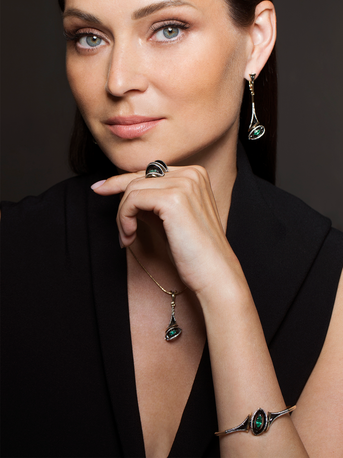 Его силуэт наполнен легкостью, визуальным простором — ни одной лишней детали. Все элементы украшения находятся в гармонии друг с другом: бриллианты подчеркивают плавные линии силуэта, а изумруд добавляет ему сдержанной роскоши.