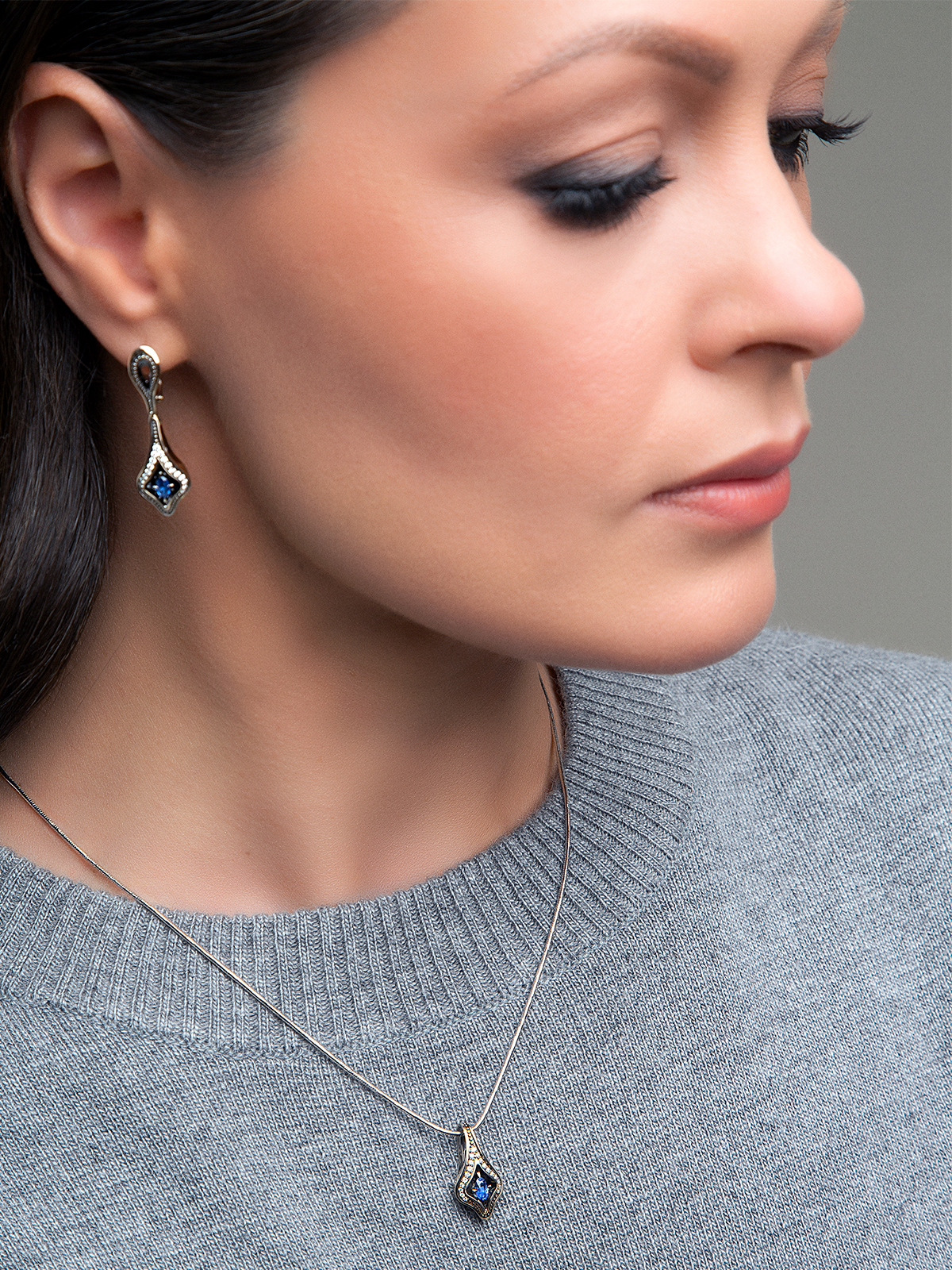 В центре украшения находится яркий сапфир, чье сияние подчеркивается темной подложкой, созданной при помощи еще одного классического ювелирного приема, эффекта чернения. Как и в других коллекционных украшениях Ringo, здесь определенно есть стиль, присутствует роскошь — и безусловная оригинальность, что делает ювелирный шедевр из коллекции Bridges.