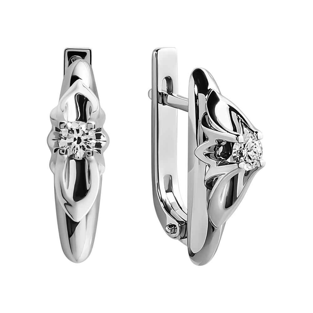 Взгляните на великолепный силуэт серег — будто сотканных из ажурных золотых нитей! Необычный узор в центре композиции напоминает крылья бабочки. А в самом центре украшения находится крупный бриллиант классической огранки.