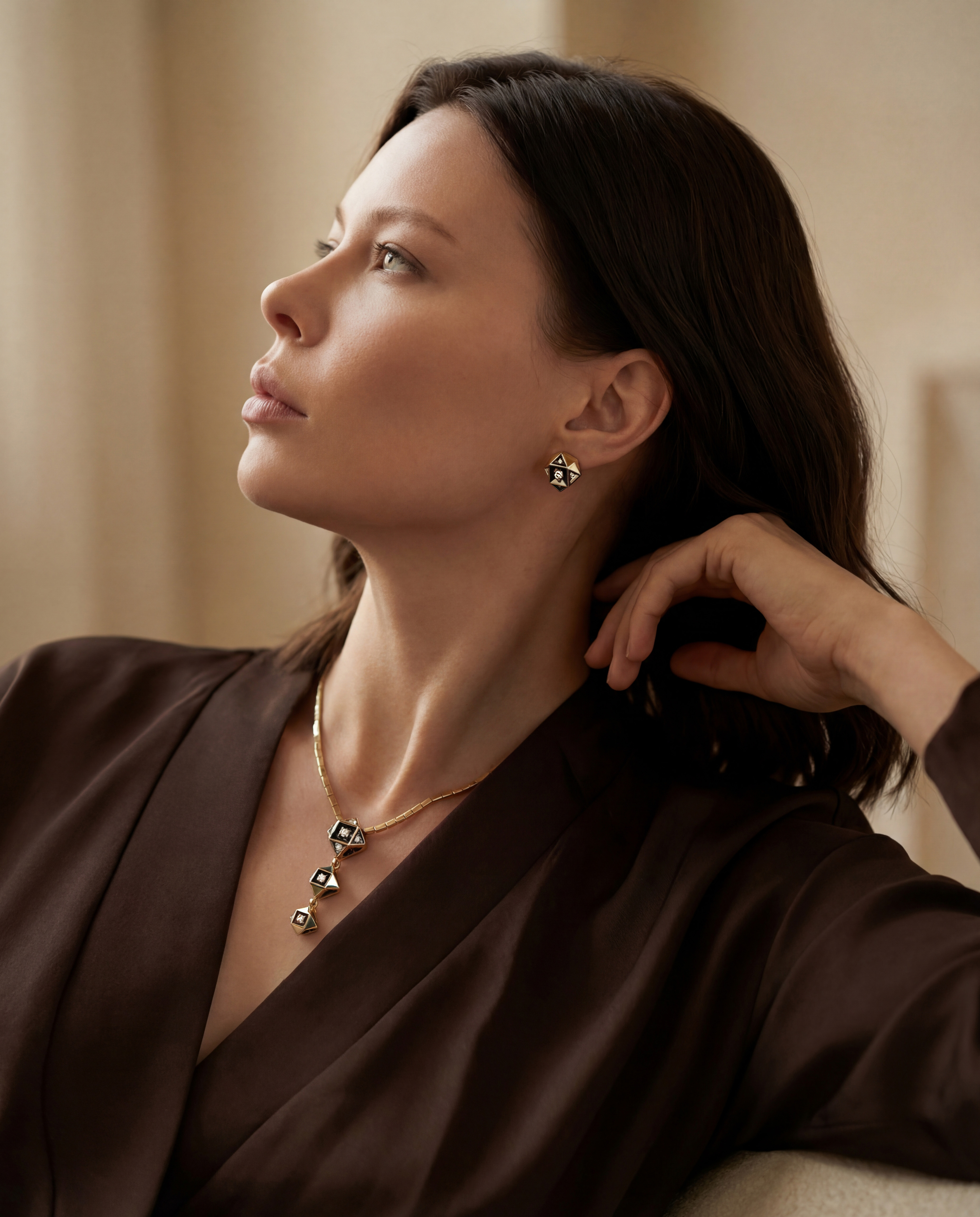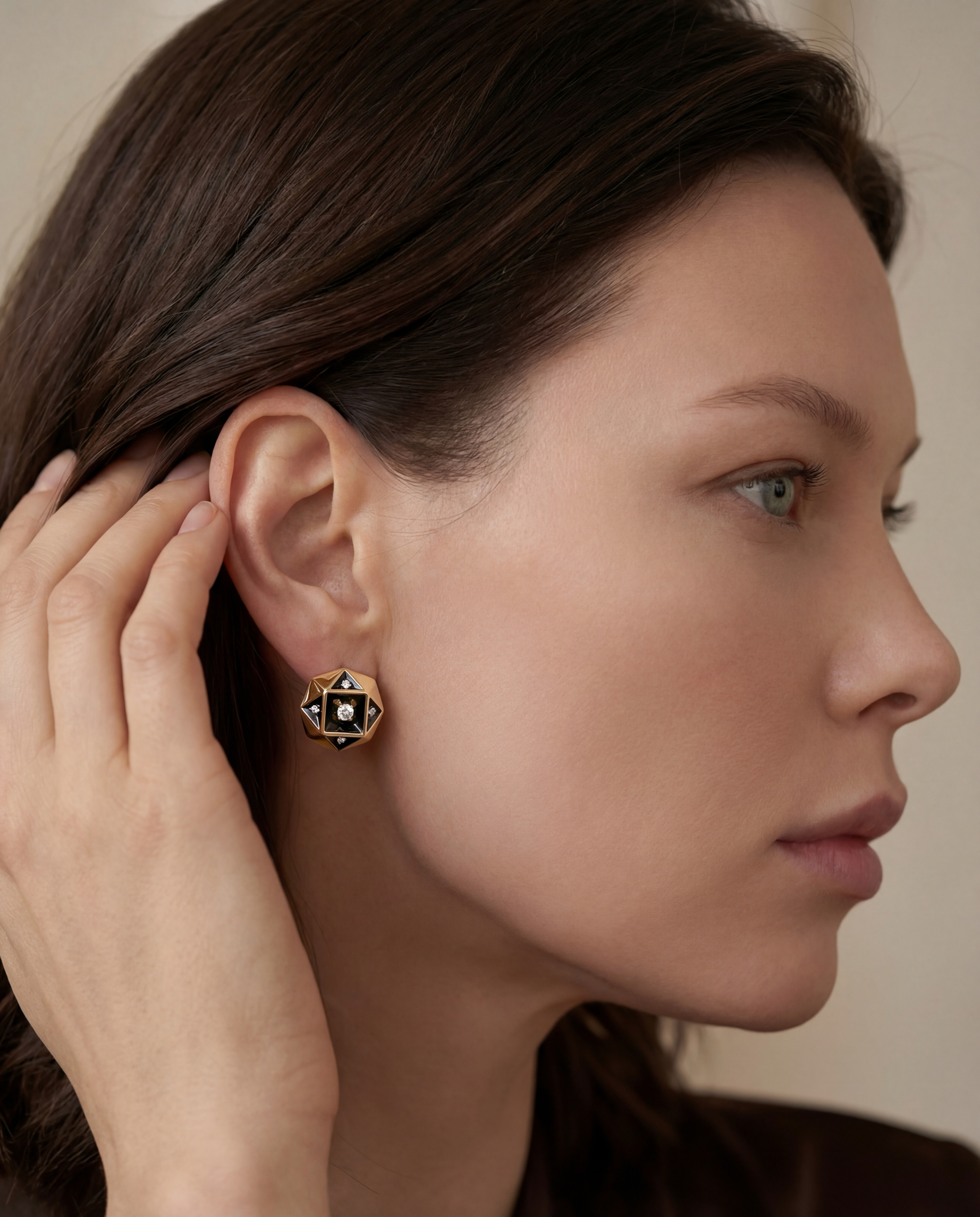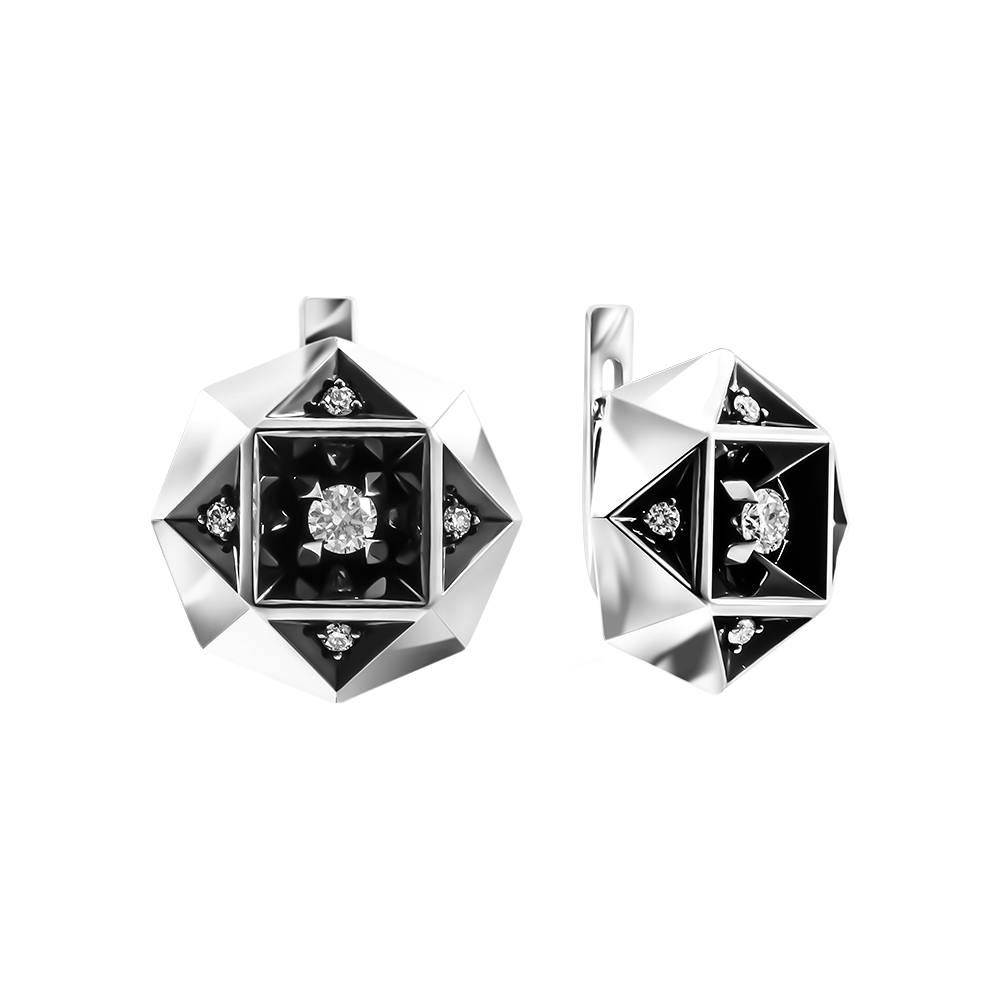 Серьги из коллекции Crystal с бриллиантами и чернением, выполненные из белого или жёлтого золота, отражают современный дизайн с элементами контраста. Технология рутенирования придаёт серьгам чёрную глубину, которая усиливает блеск бриллиантов. Зеркальные плоскости белого золота создают динамичный эффект, отражая свет и привлекая внимание.
