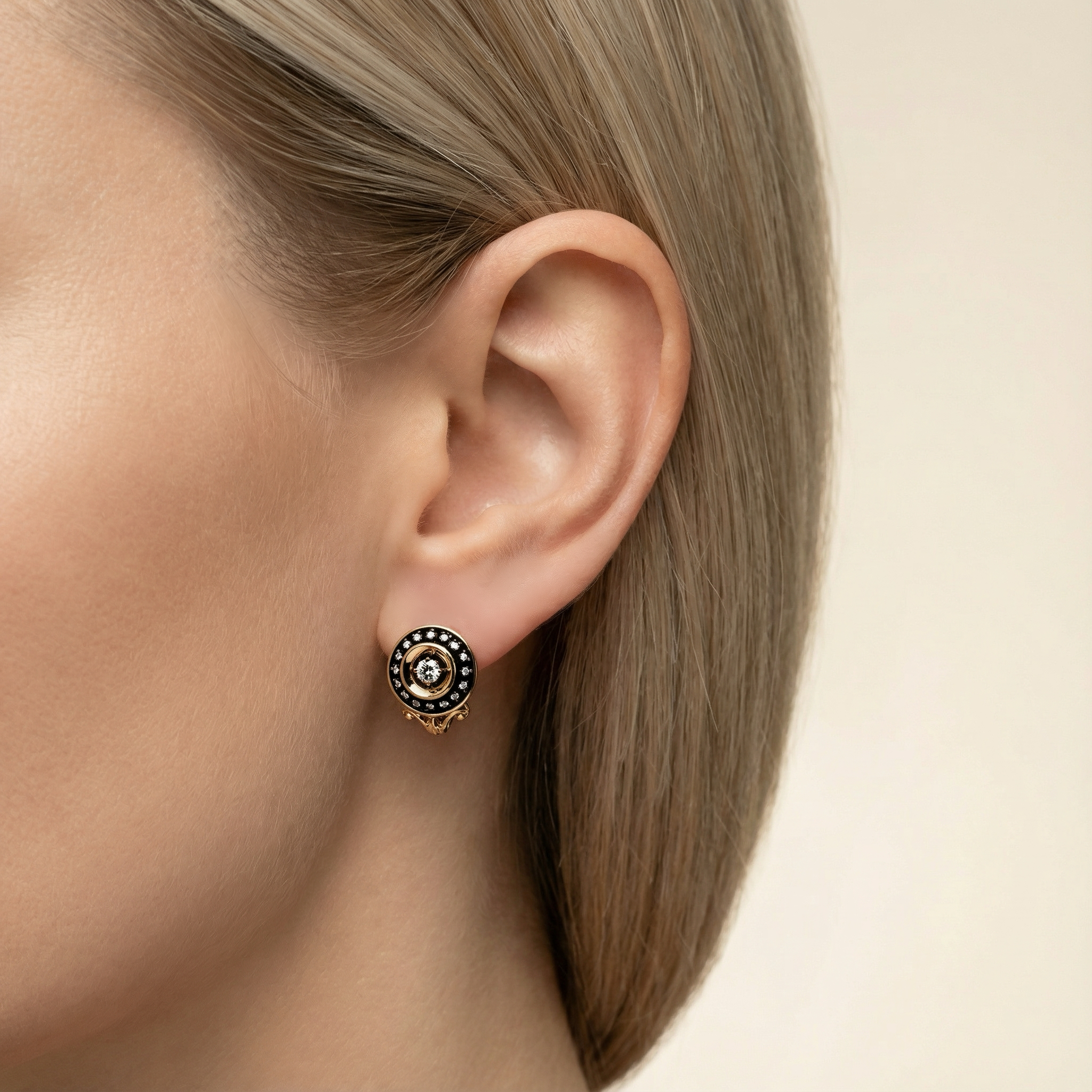 Изящная форма идеального круга (точнее, двух, вписанных друг в друга) украшена инкрустацией из небольших бриллиантов. Для усиления блеска драгоценных камней ювелиры традиционно используют эффект чернения — и здесь его применение очень даже уместно.