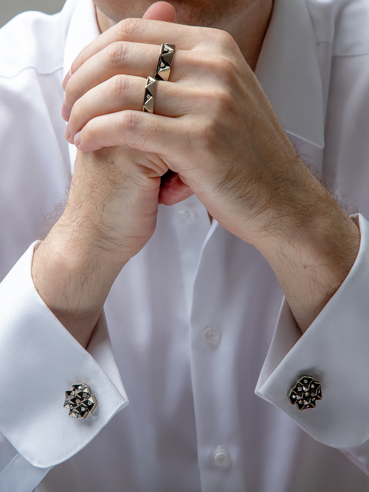 Запонки из коллекции Men's Line с бриллиантами и чернением, выполненные из белого или жёлтого золота, обладают сложным визуальным языком и динамичностью форм. Чернение создаёт контраст, подчёркивая сияние бриллиантов на поверхности золота. Белое золото придаёт запонкам современный вид, а жёлтое золото добавляет тепло и классический оттенок.